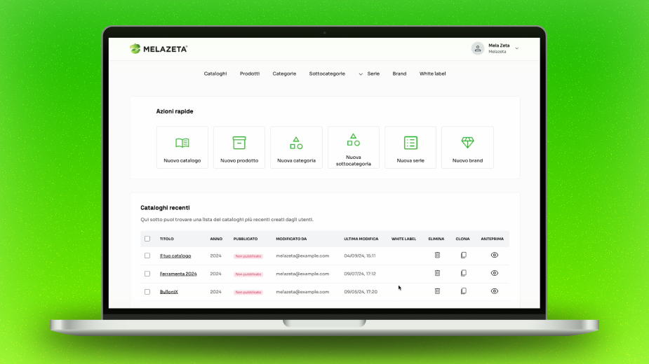 - Multicanalità integrata: condividi i tuoi cataloghi online, sui social media o via email, oppure scaricali in formato PDF per la stampa o per la consultazione online e offline.